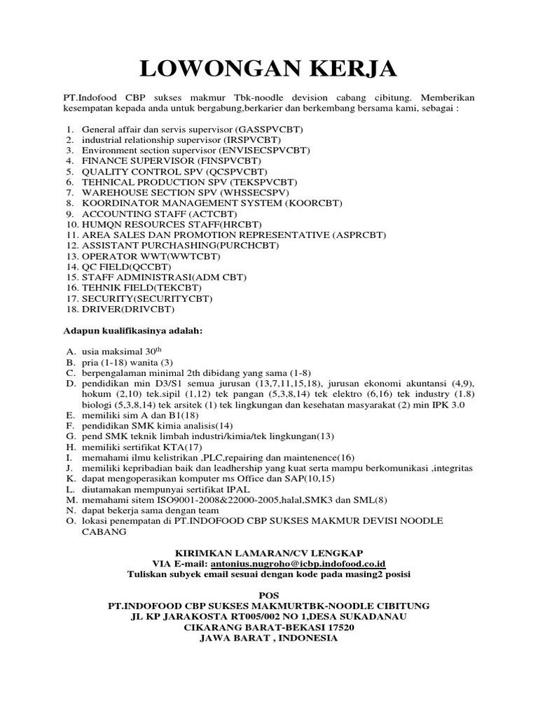 Lowongan Kerja Terbaru Pt Indofod Jarakosta / Pt Indofood Cbp Sukses Makmur Tbk Divisi Noodle Cabang Cibitung Loker Email - Pt indofood cbp sukses makmur tbk merupakan salah satu anak cabang dari indofood group yang bertugas memproduksi dan memasarkan berbagai macam produk dan .
